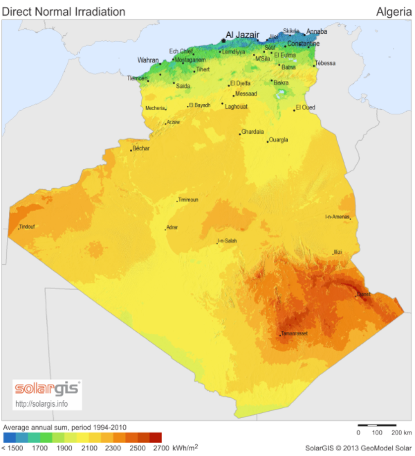 The DNI in Egyptshows a resource of 2500 along the North coast