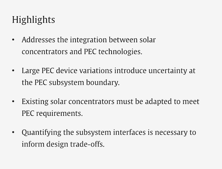 Arend Wessels Moelich, Craig McGregor, A systems engineering review on the integration of solar concentrators with photoelectrochemical processes, Renewable and Sustainable Energy Reviews, Volume 232, 2026, 116792, ISSN 1364-0321, https://doi.org/10.1016/j.rser.2026.116792.